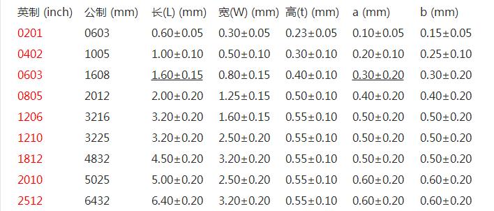 國內(nèi)通用尺寸表示是(長*寬)1.6*0.8mm(單位為mm).國際上通用尺寸表示是用英0603(單位為inch),